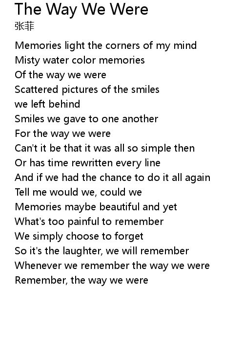 Barbara Streisand - The Way We Were (Lyrics), Barbara Streisand - The Way We Were, lyrics. . We Have got 9 pix about The Way We Were Song Lyrics images, photos, pictures, backgrounds, and more. In such page, we additionally have number of images out there. Such as png, jpg, animated gifs, pic art, symbol, blackandwhite, pics, etc. "The way we were - Petra Berger", Song from the album 'Touched by Streisand' More music on Spotify: . "The Way We Were (Lyrics) ~ Barbra Streisand", This is a lyrics video that I made for the song: The Way We Were By: Barbra Streisand ➡️ I own all the pictures that I used in this ..